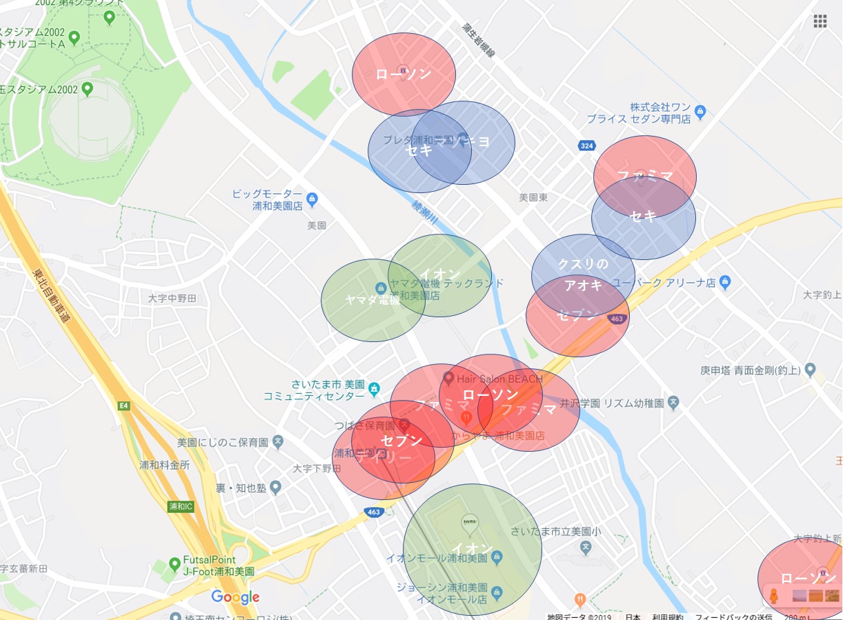 ちょっと浦和美園のコンビニとドラッグストアの位置を確認してみる。